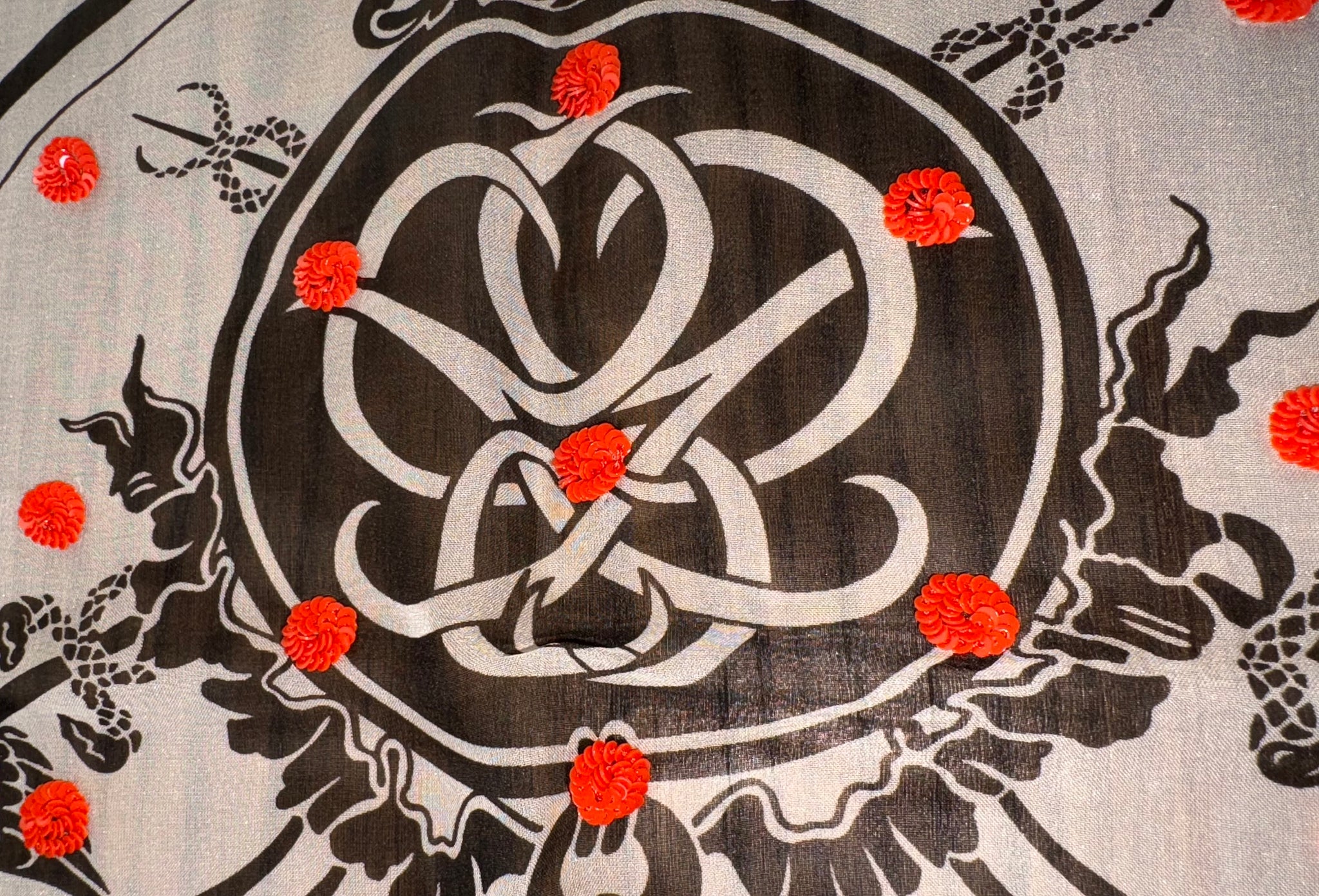 The background colours are scarlet red and white with tiny red flowers beaded by hand.