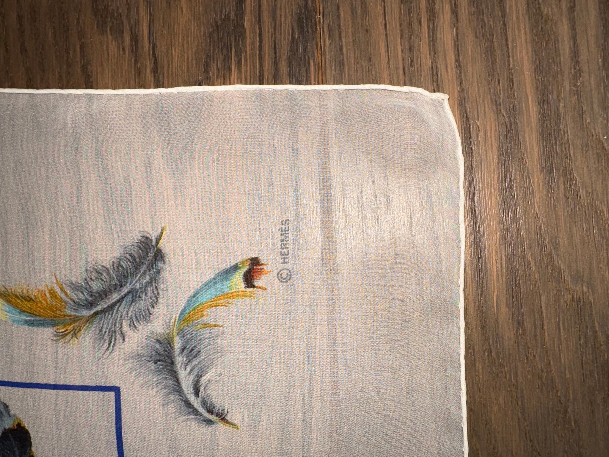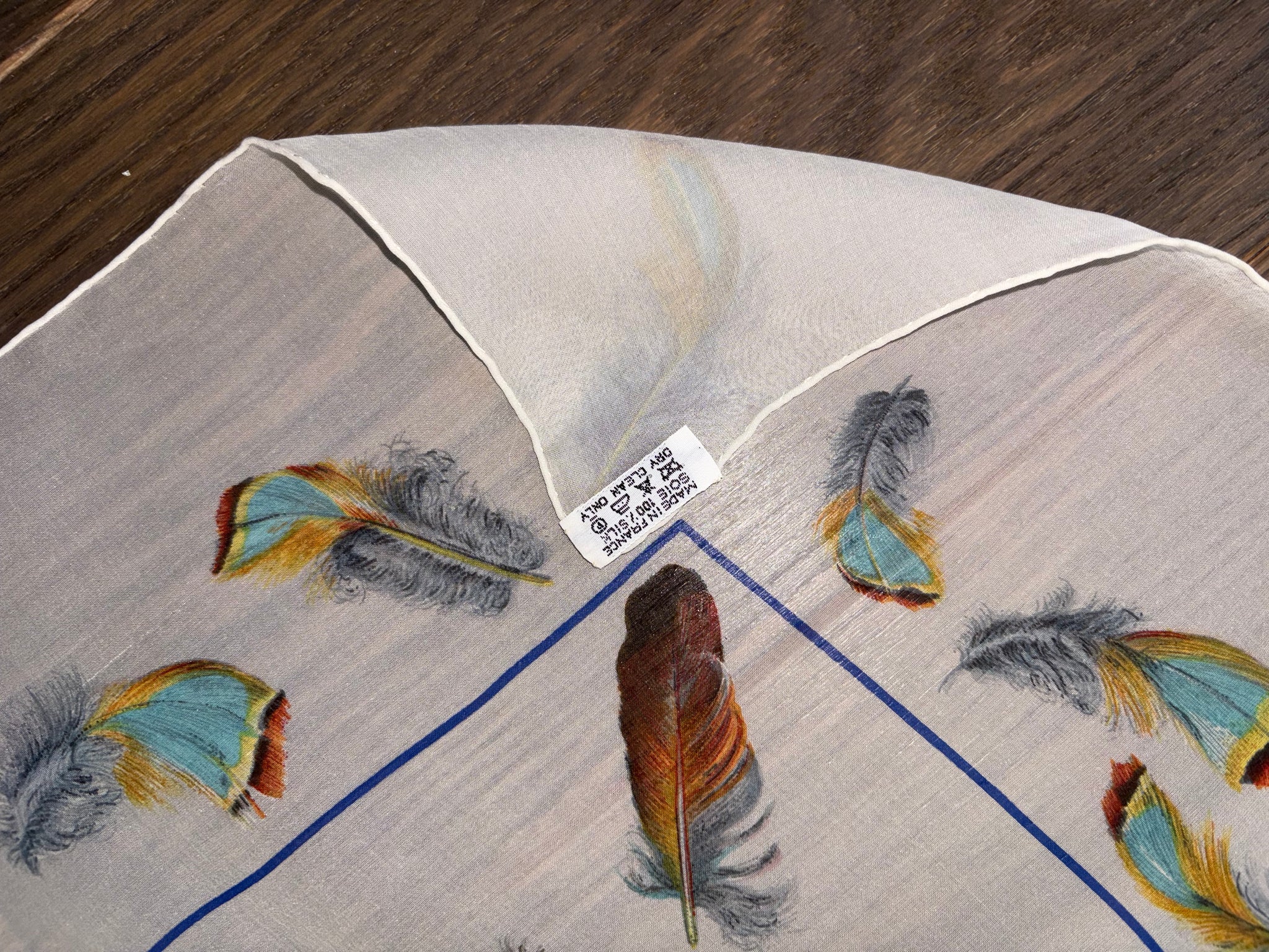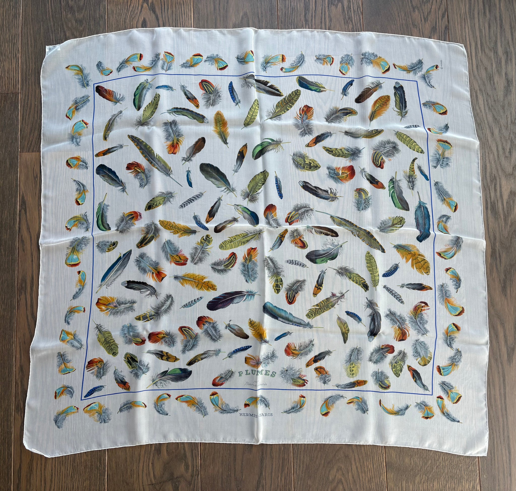 Very beautiful and rare Hermes Silk Mousseline GM Shawl “Plumes” by Henri de Linares.