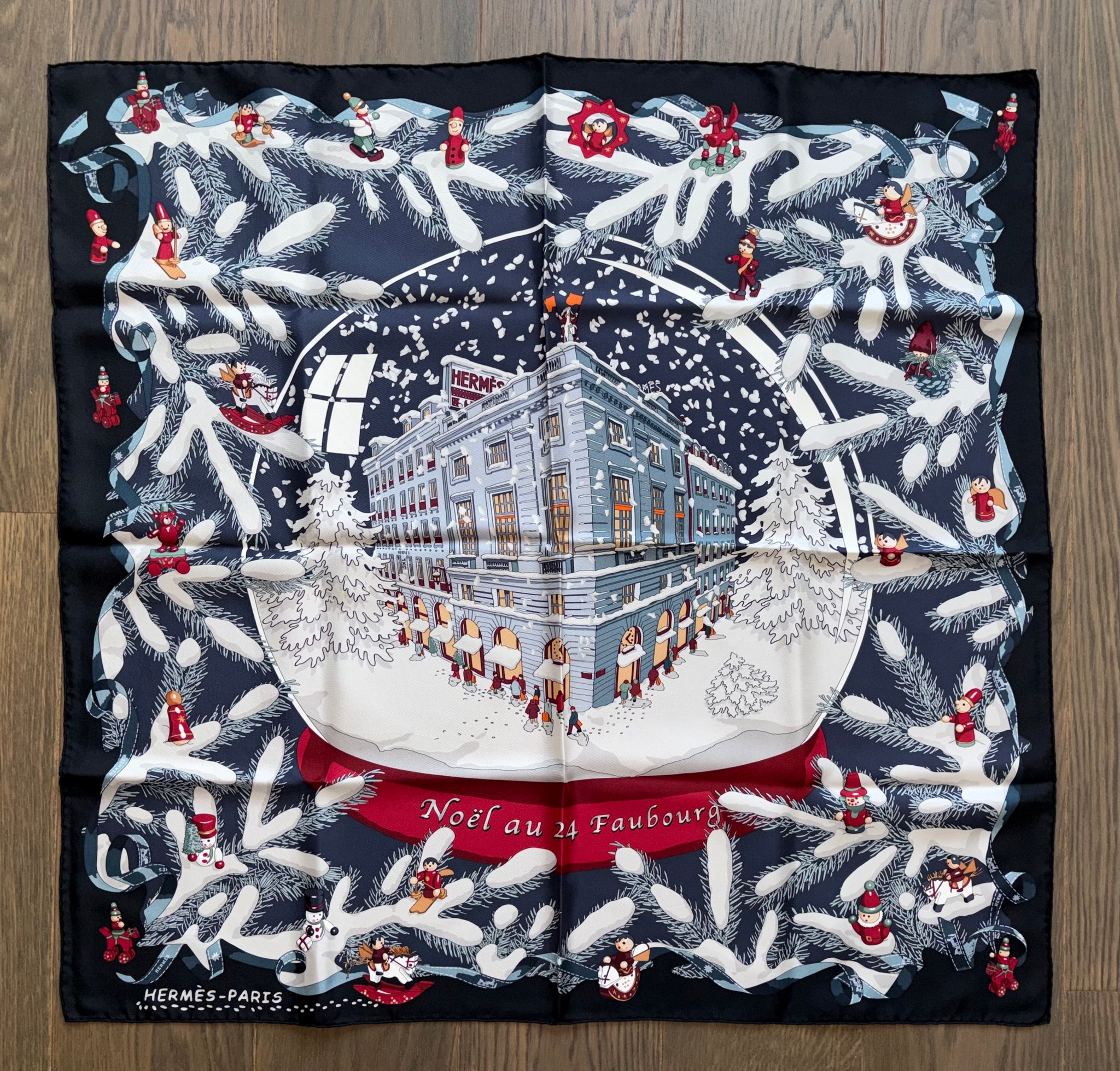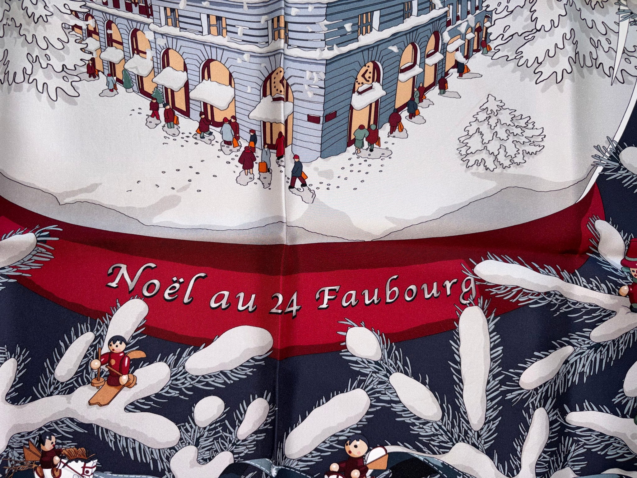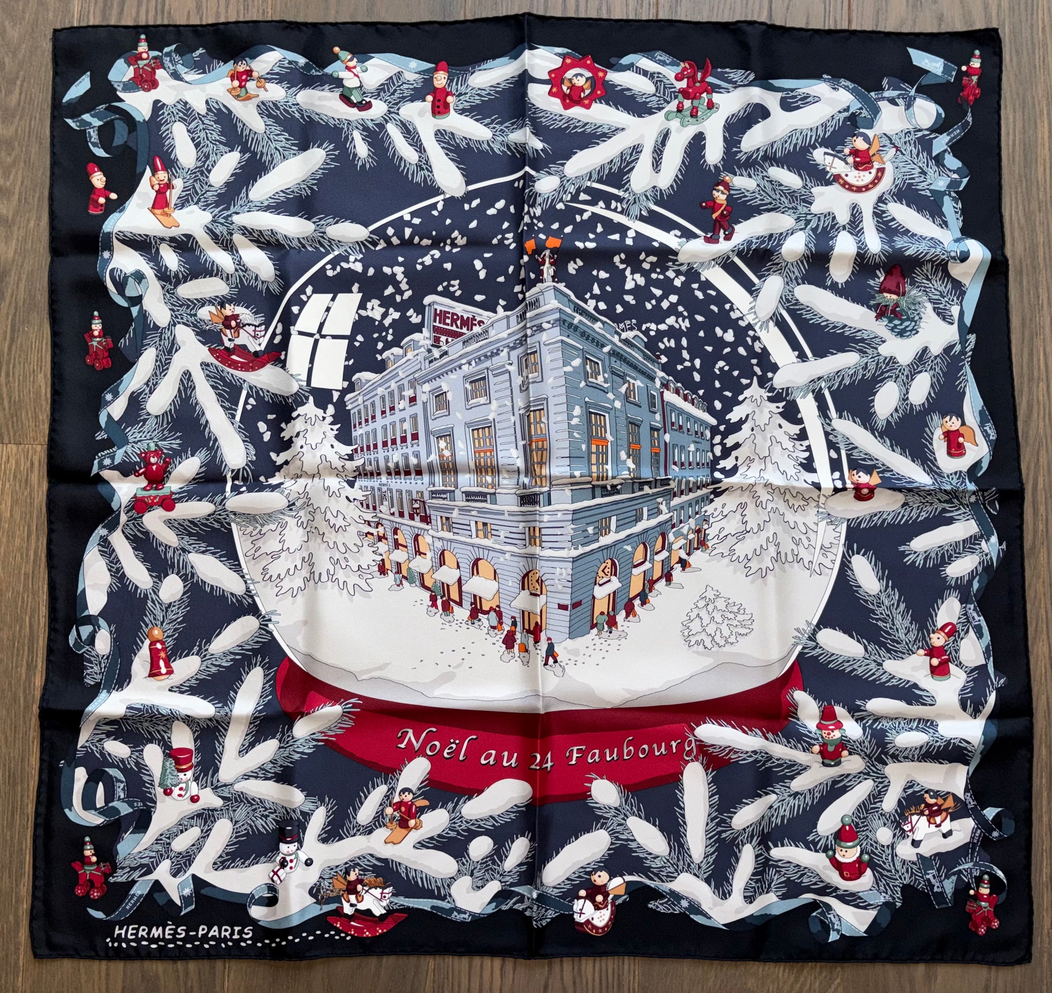 Beautiful and highly collectible HERMÈS Silk Scarf “Noël Au 24 Faubourg” by Dimitri Rybaltchenko.