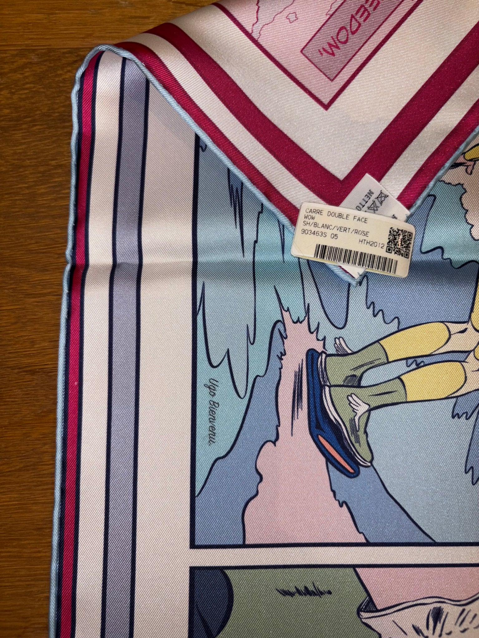Very beautiful and rare Hermes Double face scarf in silk twill “WOW” by Ugo Bienvenu.