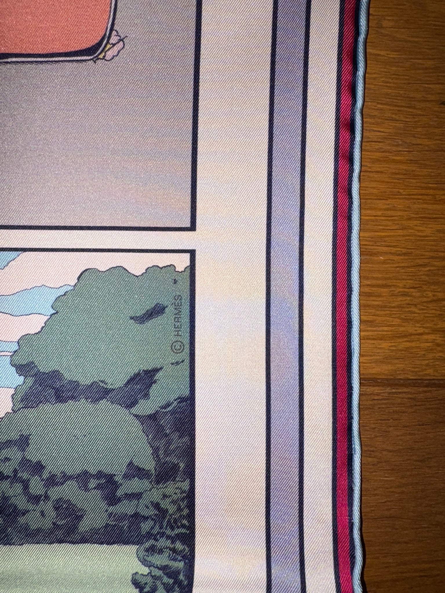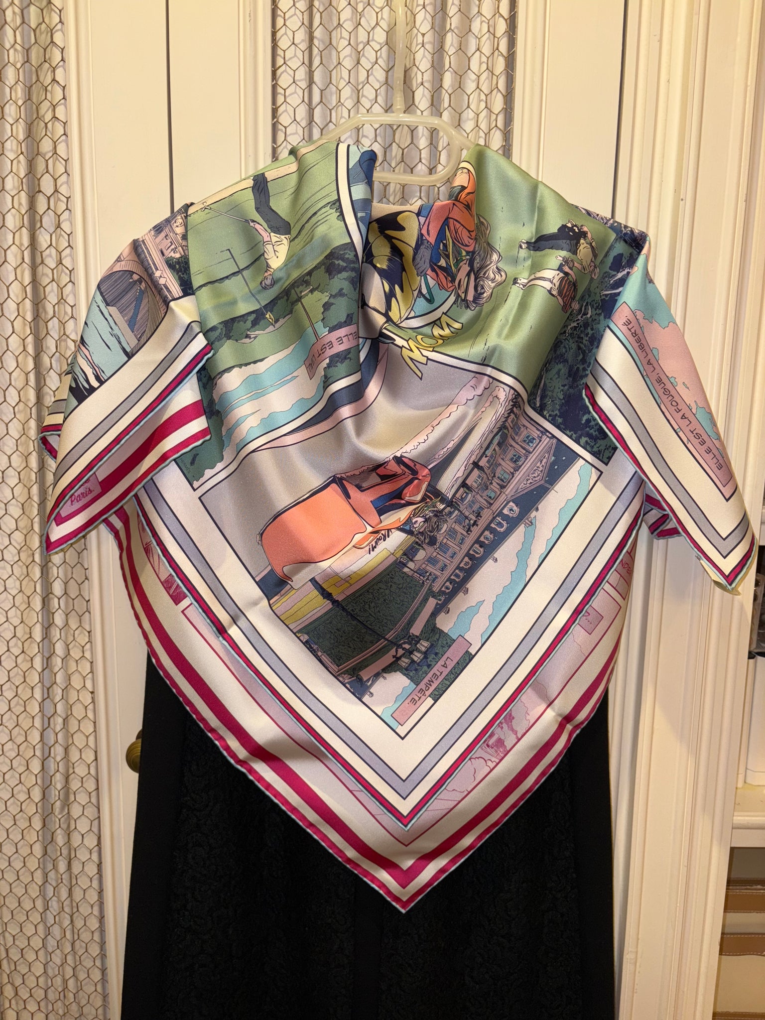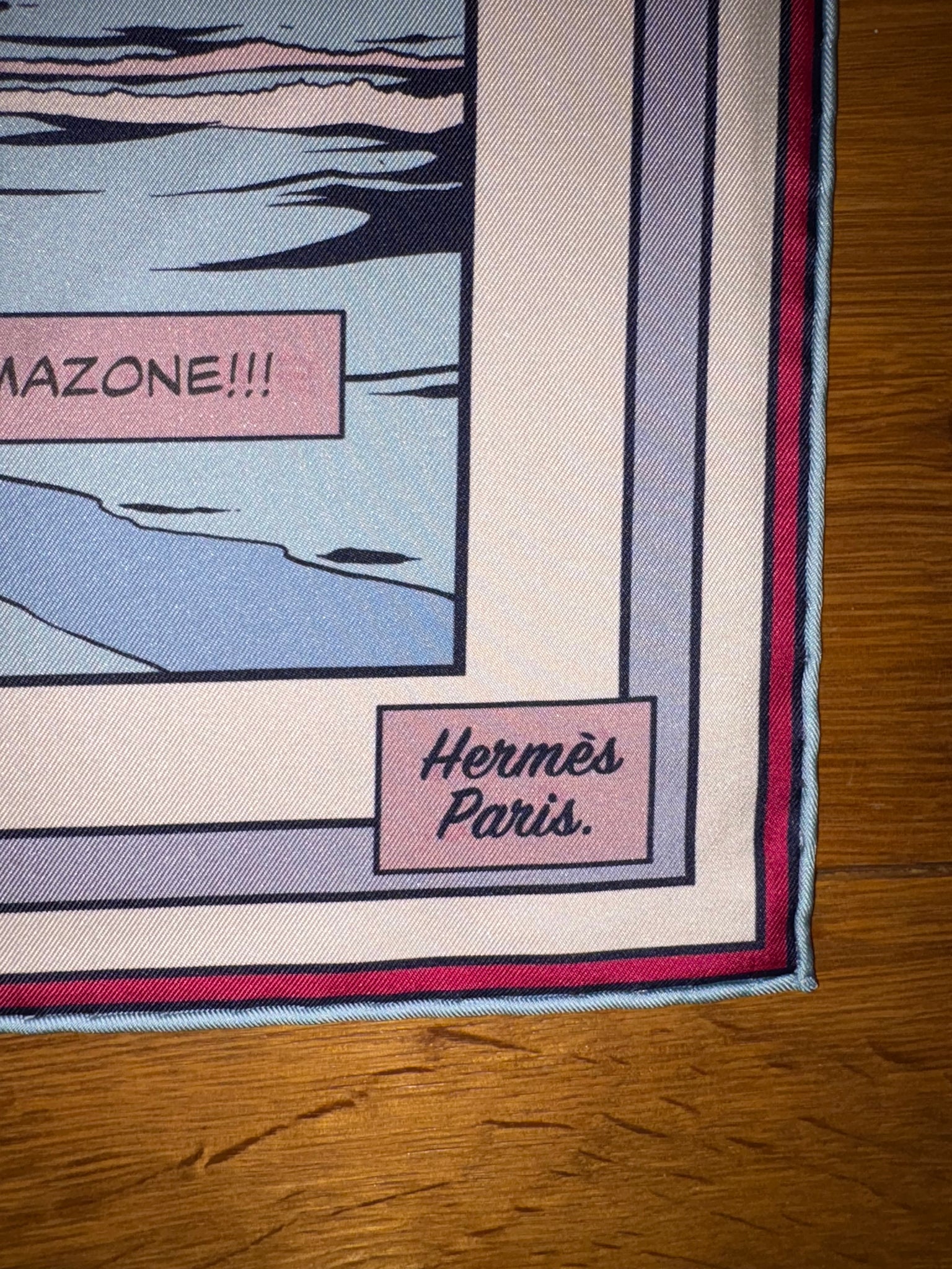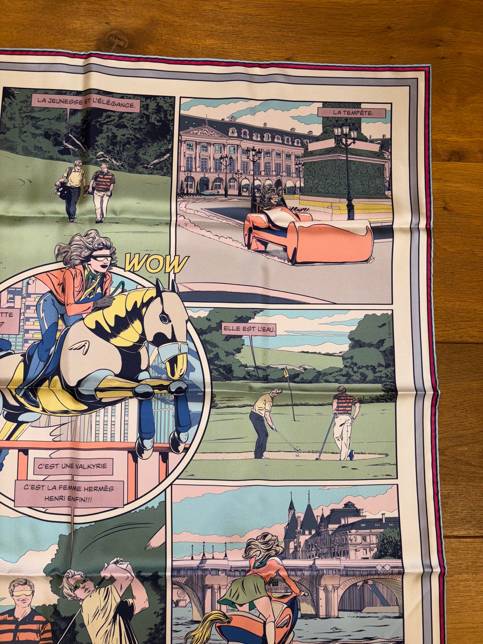 Young French artist Ugo Bienvenu is the creator of a series of short animated films produced for the house, featuring the Hermes woman. He used them as inspiration for this beautiful silk comic strip full of humor. The heroine travels across Paris in a sports car, on horseback, on rollerblades and by jet-ski. As she flies past, feisty and fearless in all circumstances, she is spotted by two golfers. "An Amazon?" they wonder. "No, the Hermes woman!" Presented on a double-sided scarf, the design plays on translation and color, offering a multicolored French version on one side and a monochrome English version on the other.
