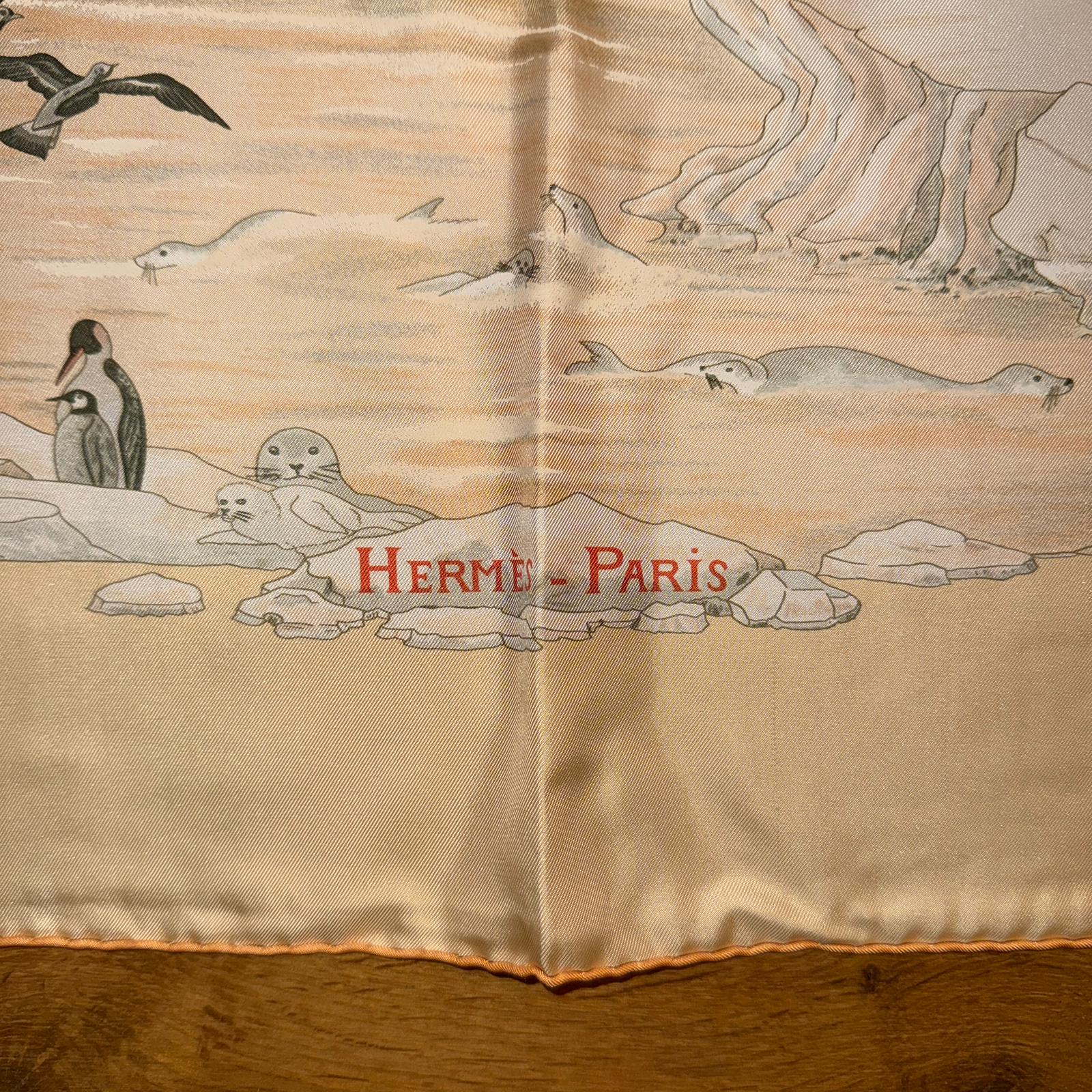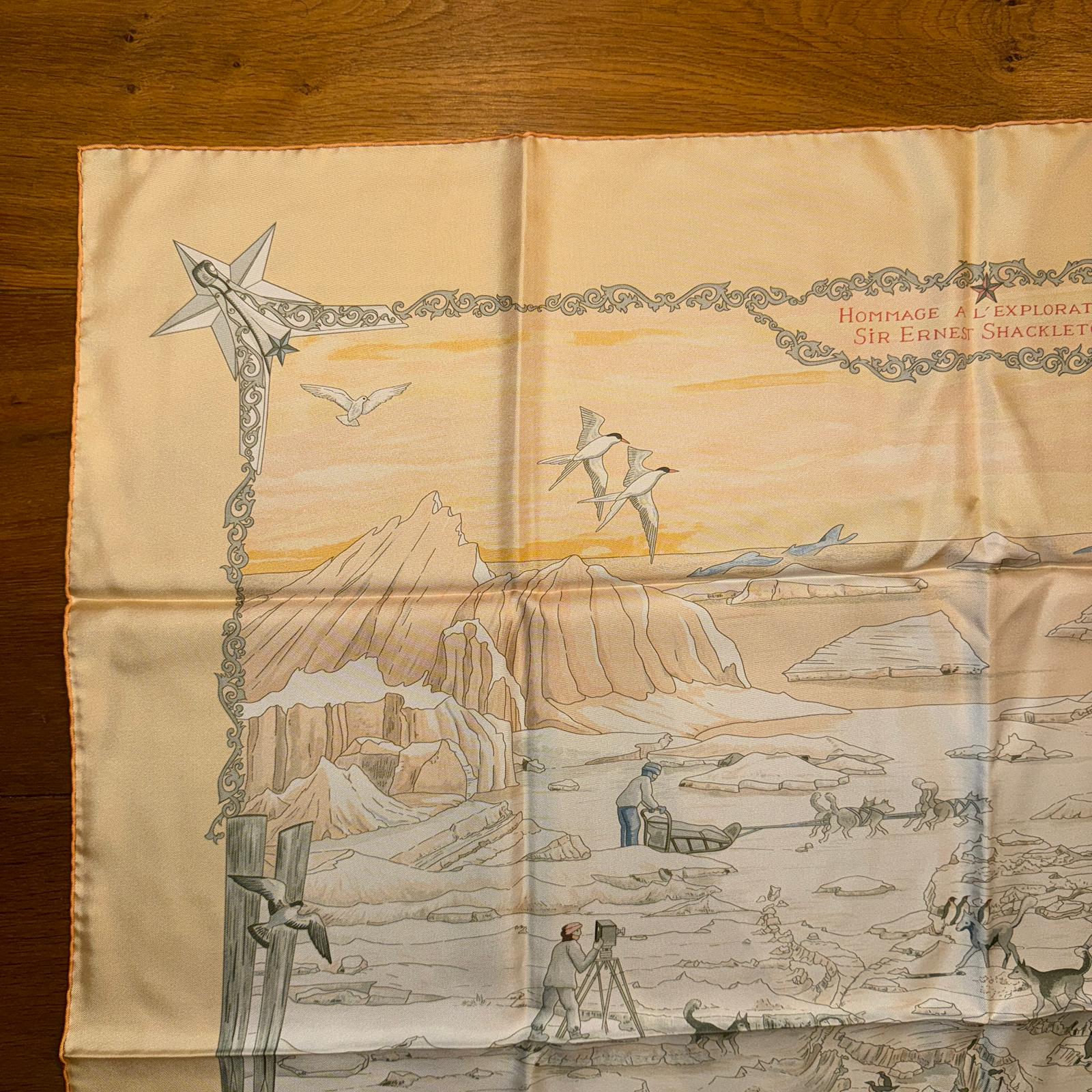 Beautiful rare and very collectible Hermes Silk Twill Scarf “Hommage a l’Explorateur Sir Ernest Shackleton” by Zoe Pauwels.